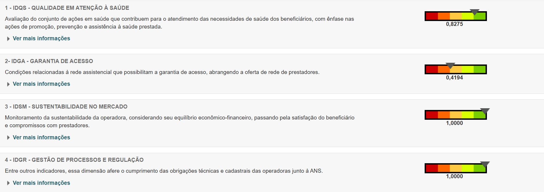 Os resultados da avaliação das operadoras são traduzidos pelo Índice de Desempenho da Saúde Suplementar (IDSS). O IDSS é composto por um conjunto de indicadores agrupados em quatro